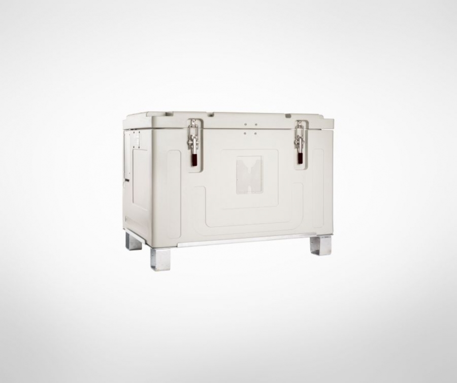 Izolowany pojemnik do przeładunku, przechowywania i transportu suchego lodu celem wyeliminowania jego strat objętościowych. Wygodne otwieranie od góry - optymalizacja ładowności. Pojemność: 430 kg suchego lodu w granulkach 3 mm, posiada podstawę z kółkami lub na palecie.